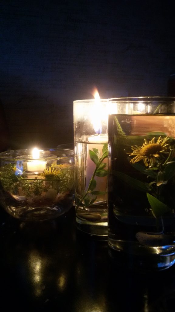 Свечи в летних подсвечниках и цветок в воде. Творить было очень увлекательно. А сидеть потом при свечах в семейном кругу … это бесценно!