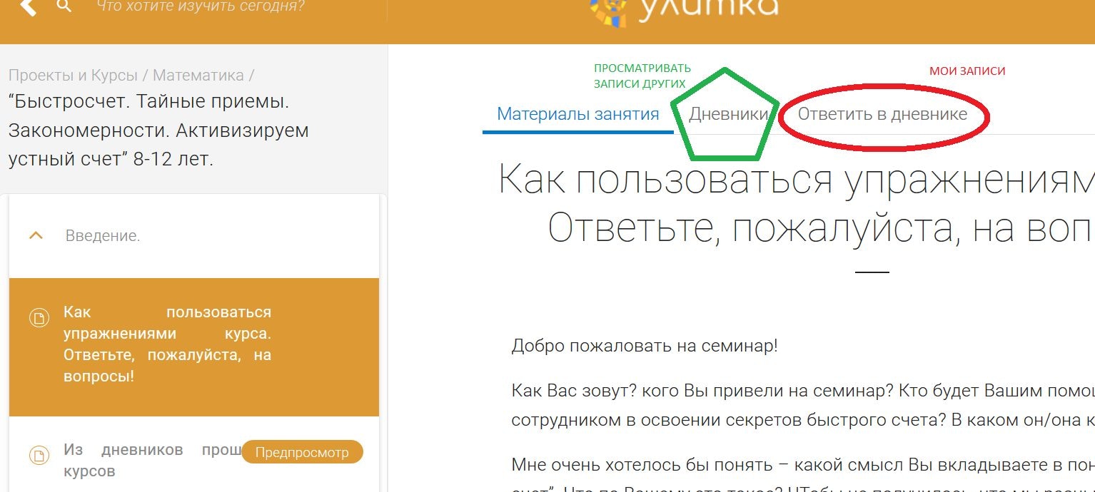 Нажмите, пожалуйста, на кнопку ОТВЕТИТЬ В ДНЕВНИКЕ и напишите ответ. Это будет вашей первой страницей. Курс устроен так, что писать можно только из определенных уроков. А вот править и просматривать дневник свой и других можно из раздела ДНЕВНИКИ.